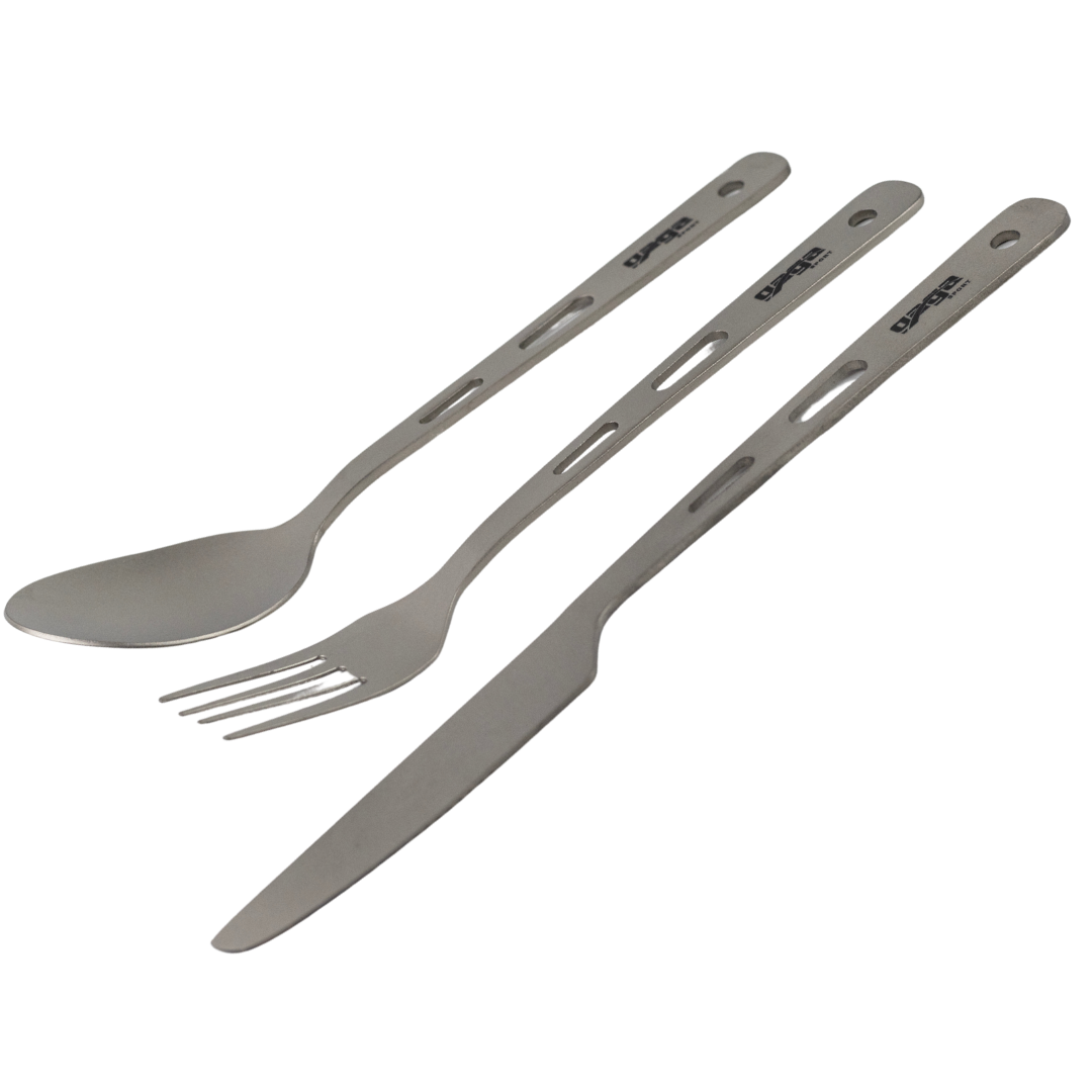 A durable, ultralight titanium cutlery kit designed for outdoor meals and everyday carry. Built to pack small, clean easily, and replace disposable utensils—ideal for backpacking, camping, travel, lunch boxes, and emergency kits.